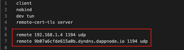 步驟2.9(如果連接不起作用-第1部分):您可能需要編輯.ovpn文件。為此,請(qǐng)?jiān)?txt編輯器中打開(kāi).ovpn文件,并更改第6行和第7行的順序。將本地網(wǎng)絡(luò)IP放在遠(yuǎn)程網(wǎng)絡(luò)IP上方。