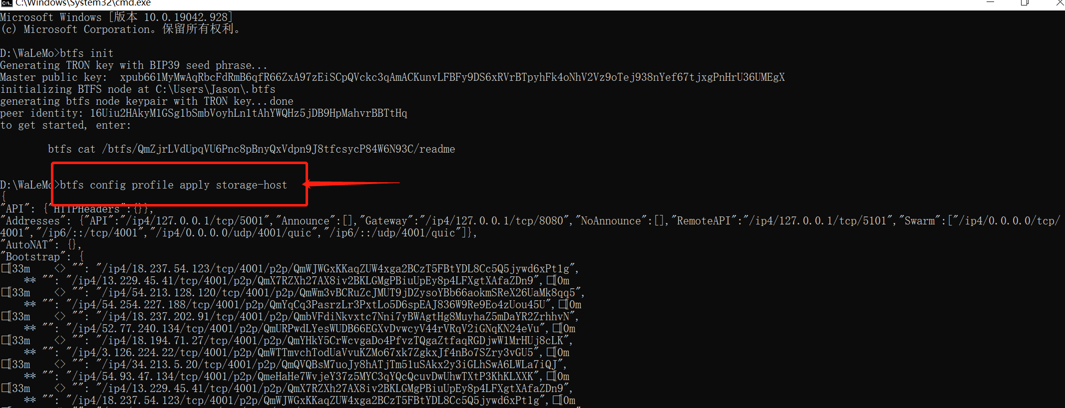 然后在窗口輸入 btfs init 回車,執(zhí)行初始化 如下圖:
