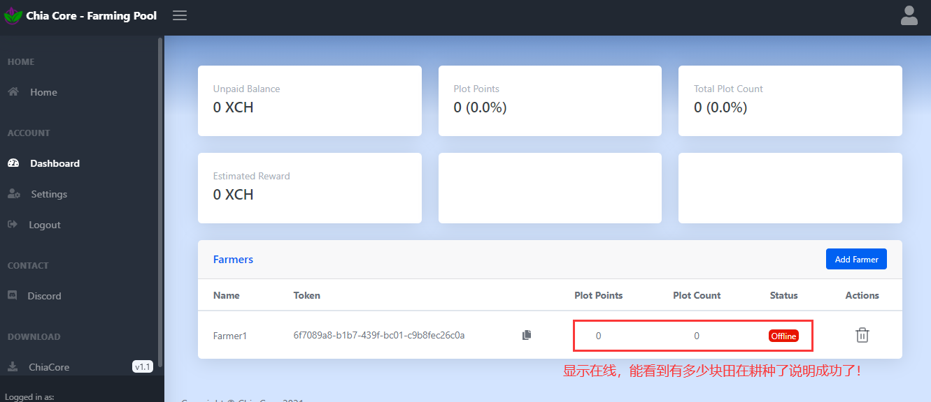 注:如果讀不到田,啟動了官方chia軟件,過一下就會讀得到,網(wǎng)頁上就會馬上顯示在線并顯示有多少塊田。
