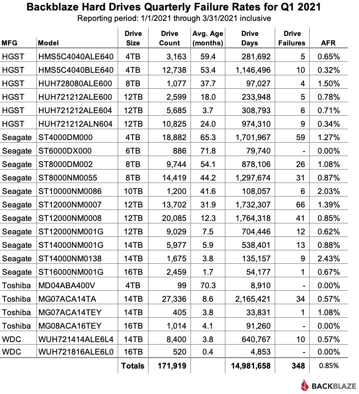 Backblaze,Inc.是一家云存儲和數(shù)據(jù)備份公司,成立于2007年。自2013年以來,Backblaze已基于其數(shù)據(jù)中心的硬盤發(fā)布了統(tǒng)計信息和見解。他們剛剛發(fā)布了2021年第一季度的驅(qū)動器統(tǒng)計數(shù)據(jù)。他們的數(shù)據(jù)與像我們這樣的最終客戶非常相關(guān),因為他們使用的是零售業(yè)務(wù)提供的設(shè)備。