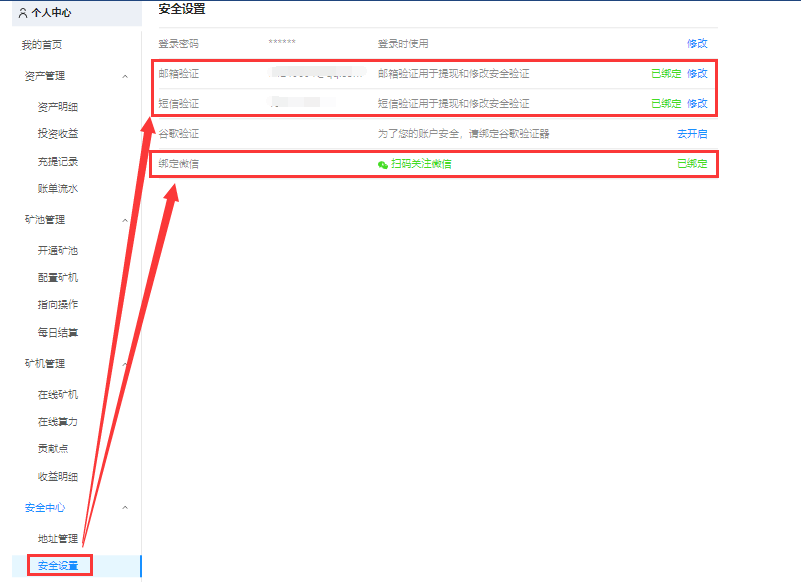 然后進(jìn)入礦池點擊【安全設(shè)置】—-然后綁定一下,郵箱驗證,短信驗證,綁定微信。綁定這三樣就可以開始去提現(xiàn)。