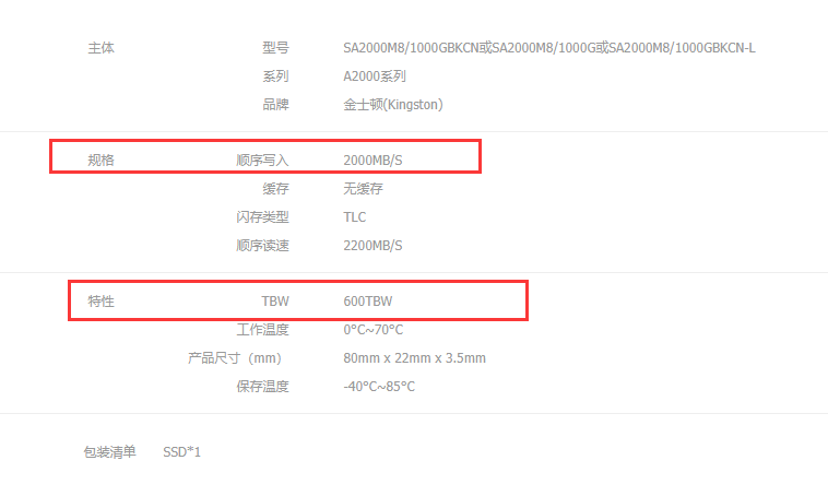3、金士頓(Kingston) 1TB SSD固態(tài)硬盤 M.2接口(NVMe協(xié)議) A2000系列