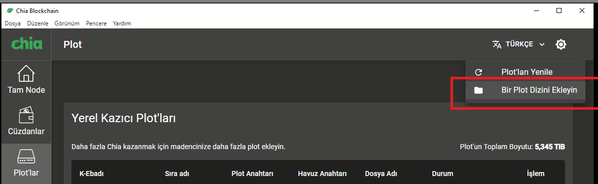 然后,在Chia Blogchain應(yīng)用程序中,進(jìn)入Plots部分,然后單擊右上角的ADD A PLOT INDEX。