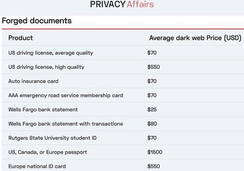 ①網(wǎng)上銀行登錄的平均費用為$35 ②完整的信用卡詳細信息,包括相關(guān)數(shù)據(jù),價格為$12-20 ③可以獲得身份盜竊的全套文件和帳戶詳細信息,價格為1,500美元 可以訂購包括駕照,護照和自動保險卡在內(nèi)的偽造文件,以匹配被盜的數(shù)據(jù)。 研究小組掃描了暗網(wǎng)市場,論壇和網(wǎng)站,以創(chuàng)建與個人數(shù)據(jù),偽造文件和社交媒體相關(guān)的一系列產(chǎn)品和服務(wù)的價格指數(shù)。