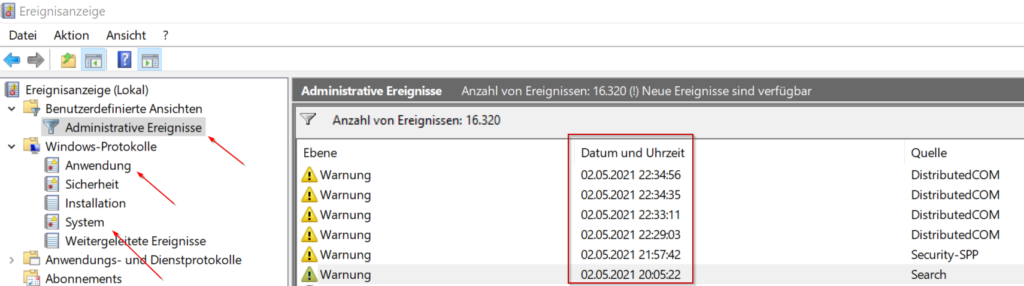 您還可以查看Windows事件顯示。要打開(kāi)事件查看器,只需在開(kāi)始菜單中輸入“事件查看器”。首先,導(dǎo)航到“管理事件”,并查找警告和錯(cuò)誤。您也可以在“應(yīng)用程序”和“系統(tǒng)”下查看。如果您知道崩潰的大概時(shí)間,這將很有幫助,以便能夠進(jìn)一步縮小問(wèn)題的范圍。