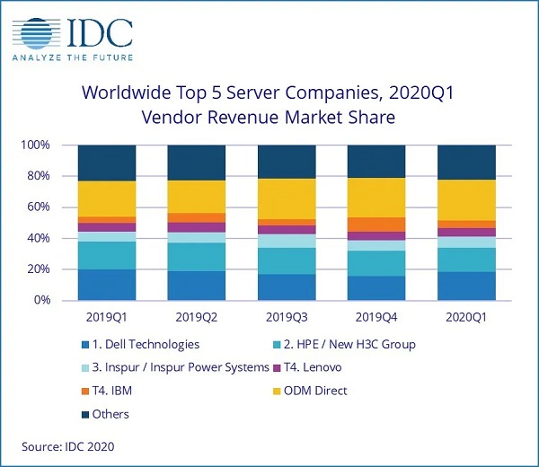 戴爾技術(shù)公司(Dell Technologies)以18.7%的收入份額位居2020年第一季度全球服務(wù)器市場(chǎng)的頭把交椅。HPE/New H3C集團(tuán)以15.5%份額位居第二,緊隨其后的是浪潮/Inspur Power Systems(7.1%)。聯(lián)想和IBM并列第四,市場(chǎng)份額分別為5.6%和4.8%。ODM Direct供應(yīng)商集團(tuán)占服務(wù)器總收入的25.9%,同比增長(zhǎng)6.1%,達(dá)到近48.3億美元。戴爾技術(shù)在全球服務(wù)器出貨量方面處于領(lǐng)先地位,占本季度出貨量的18.4%。