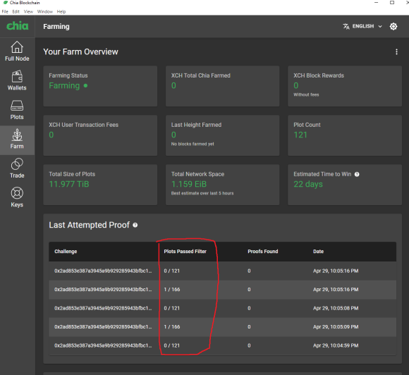 6. 啟動(dòng)收割機(jī)收割任務(wù):./chia.exe start harvester回車。成功啟動(dòng)后,保持該命令行窗口打開,不要叉掉。馬上就可以在主機(jī)器的farm頁面看到收割機(jī)工作了。不過現(xiàn)在圖形界面的顯示有bug,預(yù)計(jì)時(shí)間和農(nóng)田數(shù)不會(huì)更新。可以在通過初篩的地方確認(rèn)收割機(jī)工作。比如說我這里,主機(jī)器里面有121張圖,收割機(jī)一邊p圖一邊在收割,已有166張圖,可以在通過初篩的地方看到。