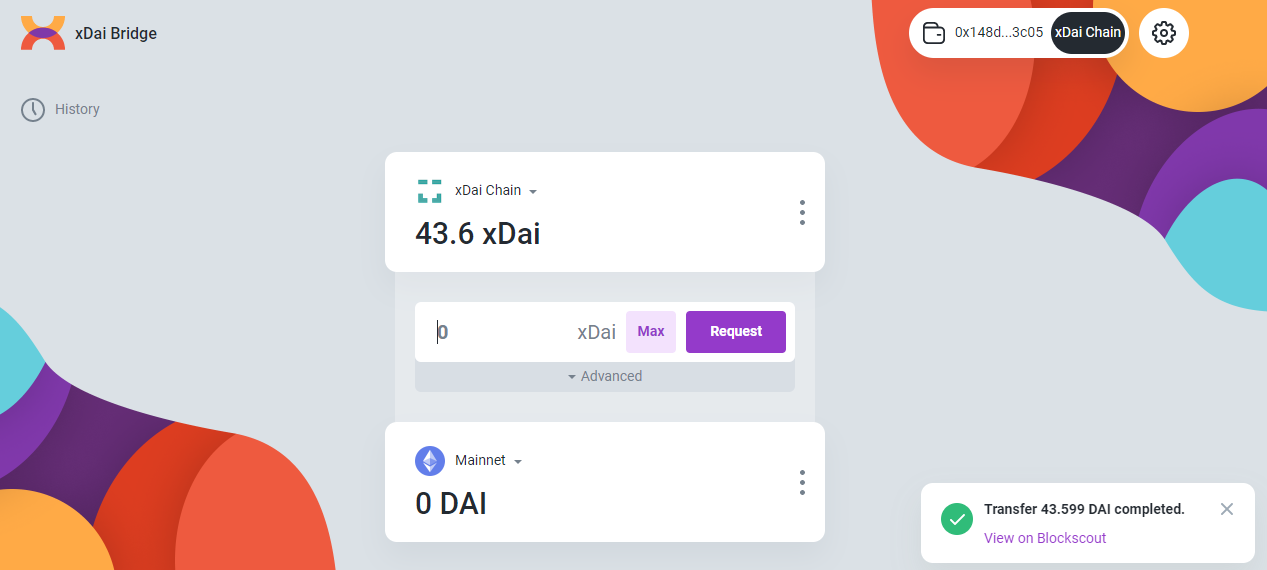 3、兌換XDAI:進入https://bridge.xdaichain.com/?然后兌換就可以了。(手續(xù)費為ETH 換算成人民幣大概錢多)。所以要換XDAI換得越多越劃算。