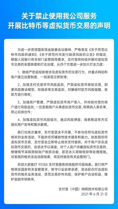 聲明稱,禁止使用公司服務(wù)開展比特幣等虛擬貨幣交易,一經(jīng)發(fā)現(xiàn)將立即采取暫停相關(guān)賬戶交易、終止金融服務(wù)等措施。