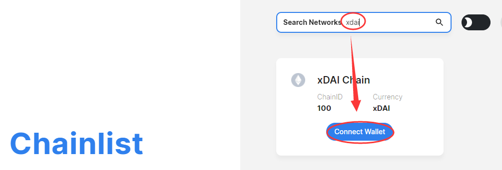 進入網(wǎng)站后。輸入【xdai】搜索出后再點擊【Connect Wallet】