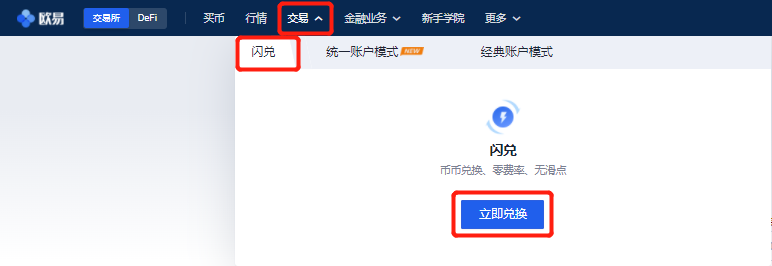 第一步:點(diǎn)擊導(dǎo)航欄【交易】,選擇閃兌,點(diǎn)擊立即兌換