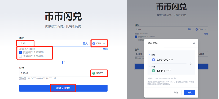 不同于訂單撮合模式,閃兌使用的是柜臺報(bào)價(jià)模式,不產(chǎn)生任何交易手續(xù)費(fèi),不存在滑點(diǎn),因此閃兌價(jià)格與現(xiàn)貨盤口價(jià)格存在一定的差價(jià)。具體模式為首先用戶向柜臺進(jìn)行詢價(jià),柜臺會根據(jù)當(dāng)前市場提供一個有競爭力的價(jià)格,如果用戶接受報(bào)價(jià),即可進(jìn)行快速交易。具體操作如下: