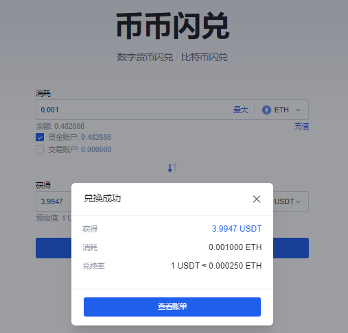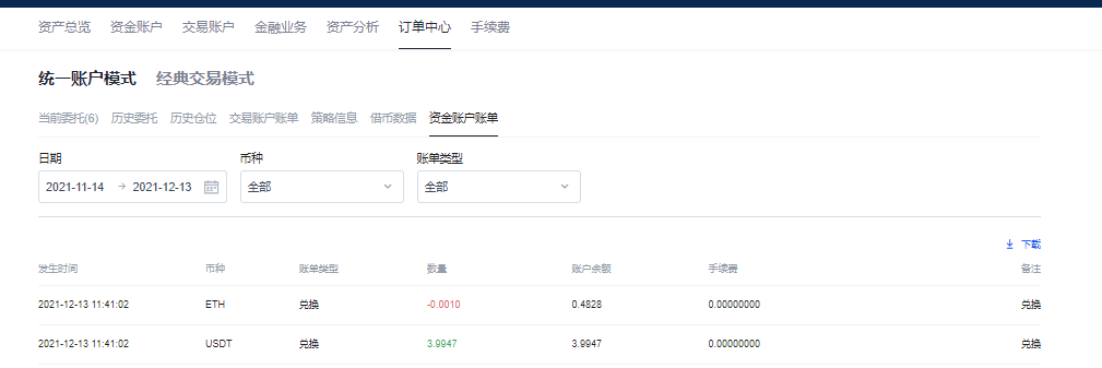 第三步:兌換獲得的數(shù)字資產(chǎn)將自動劃轉(zhuǎn)至您的資金賬戶,您可點(diǎn)擊查看賬單,也可在資產(chǎn)管理下拉列表中進(jìn)入“訂單中心”進(jìn)行查看。