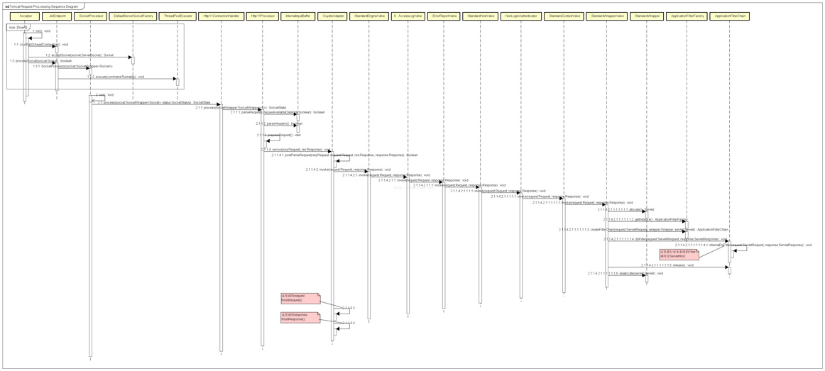 其實就是查看,它是何時調用OutputBuffer的flush方法的。我逐層查看,最終定位到了connector/Response的finishResponse()方法。這個方法,會先發(fā)送響應行和響應頭。然后再發(fā)送響應body。Tomcat的源碼我看的不多,這里找到一張不錯的時序圖,描述的是一個HTTP請求的處理過程。如下,我們把重點放在servlet的service方法調用,和Response的fininshResponse方法調用上??梢缘玫剑趕ervice方法返回后,執(zhí)行的就是finishResponse操作。也就是說,當servlet程序處理完這個請求后,tomcat就會把響應結果發(fā)回客戶端
