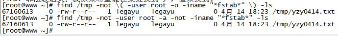 找出/tmp目錄下屬主為非root,而且文件名不包含fstab字符串的文件