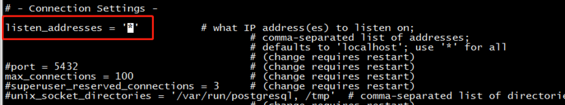 # 登錄數(shù)據(jù)庫,這里切換賬號postgres su - postgres psql # Navicat連接PostgreSQL # 這里要修改配置文件postgresql.conf find / -name postgresql.conf vi /var/lib/pgsql/11/data/postgresql.conf # 找到listen_address那里,解開注釋并修改引號內(nèi)localhost的值為* listen_address="*" # 保存并退出,重啟postgresql服務(wù) systemctl restart postgresql-11 # 阿里云安全組規(guī)則配置 -> 快速添加安全組規(guī)則 -> 選中PostgreSQL并添加 # 在navicat連接,如果不修改localhost為*,navicat連接會提示錯誤“Connection Refuse” # 我在這里修改了postgres用戶的密碼,步驟如下: ## 切換用戶后進(jìn)入psql su - postgres psql ## 修改密碼 alter user postgres password '密碼'