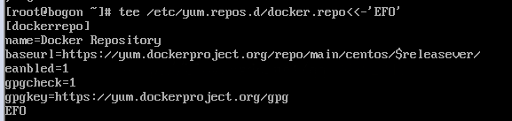 tee /etc/yum.repos.d/docker.repo <<-'EOF' [dockerrepo] name=Docker Repository baseurl=https://yum.dockerproject.org/repo/main/centos/$releasever/ enabled=1 gpgcheck=1 gpgkey=https://yum.dockerproject.org/gpg EOF