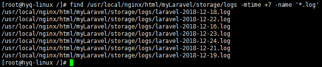 首先是查找所有 7 天前的日志,使用 find 查找的時候加上 -mtime 參數(shù),其含義為 查找在指定時間曾被更改過的文件或目錄,單位以24小時計(jì)算。實(shí)例為 find you/path -mtime +7 -name '*.log',如下