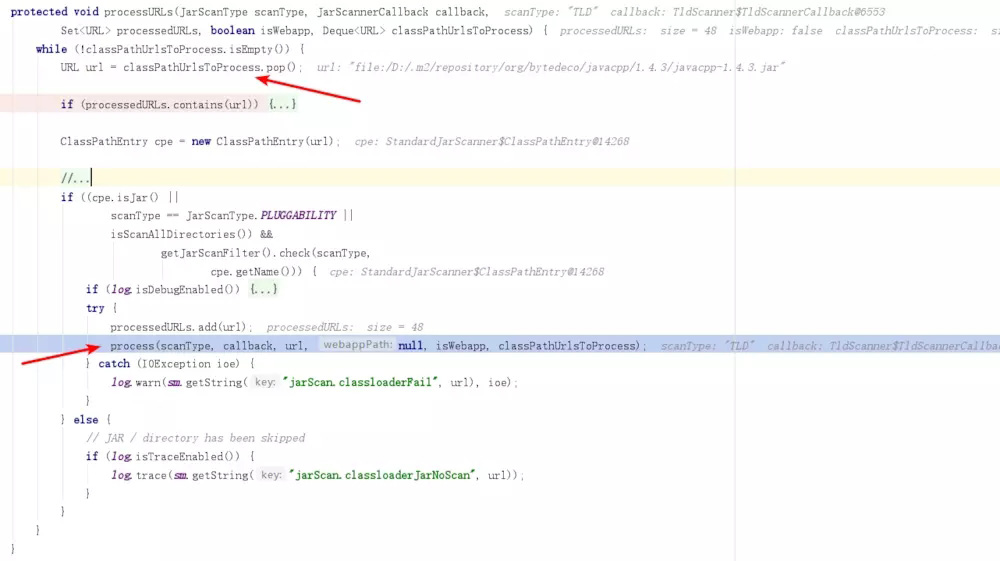 該方法會(huì)對(duì)當(dāng)前classloader的所有jar,也就是對(duì)classPathUrlsToProcess進(jìn)行堆棧操作,然后處理每一個(gè)jar包。關(guān)鍵代碼如下所示。