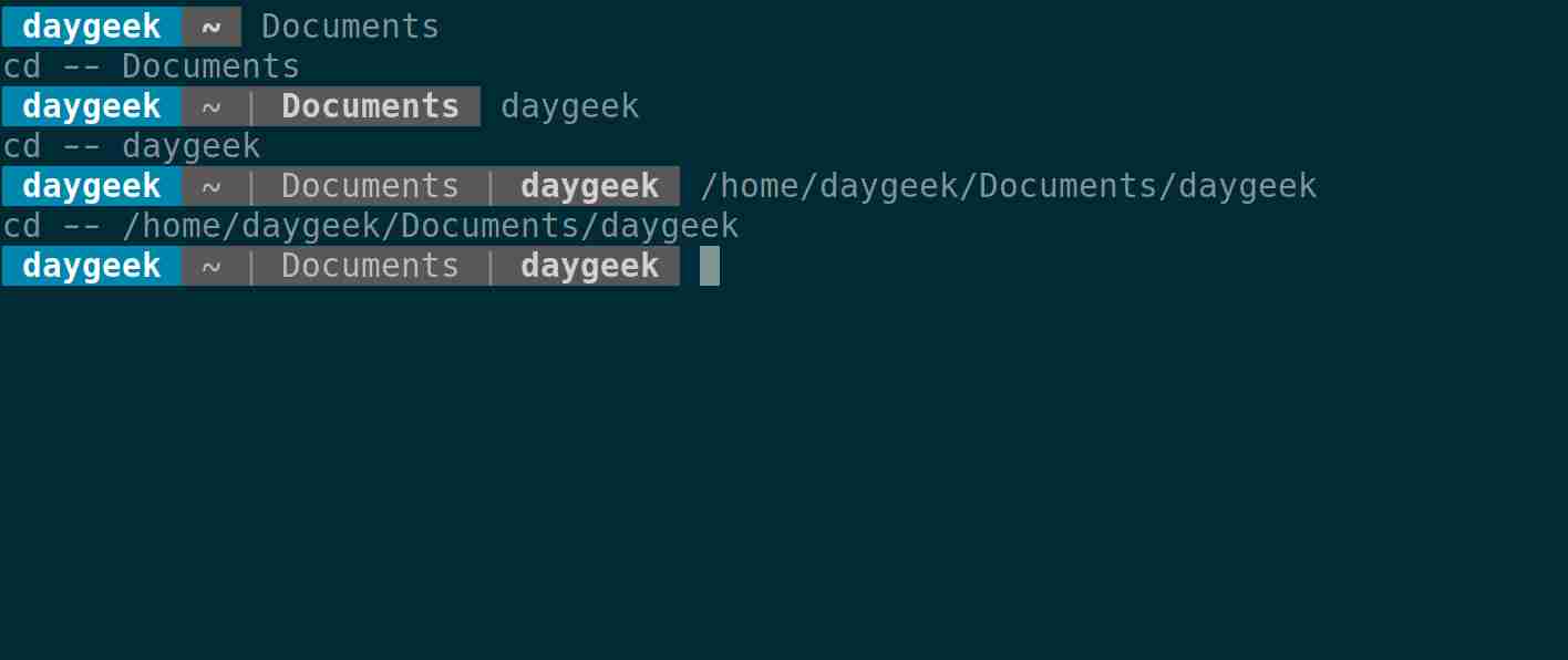 $ Documents/ cd -- Documents/ $ daygeek/ cd -- daygeek/ $ /home/daygeek/Documents/daygeek cd -- /home/daygeek/Documents/daygeek $ pwd /home/daygeek/Documents/daygeek