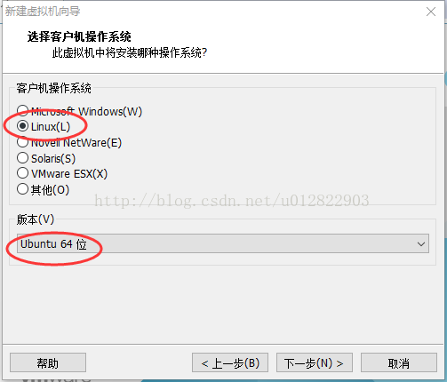 5.選擇客戶機(jī)操作系統(tǒng),選擇“Linux”,版本是“Ubuntu64位”,如果你是32位的,那就選“Ubuntu32位”。