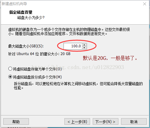 7.指定磁盤(pán)容量,默認(rèn)是“20G”,一般是夠用了,但如果你在里面要跑什么大型的比較耗資源的實(shí)驗(yàn),建議大一點(diǎn)。