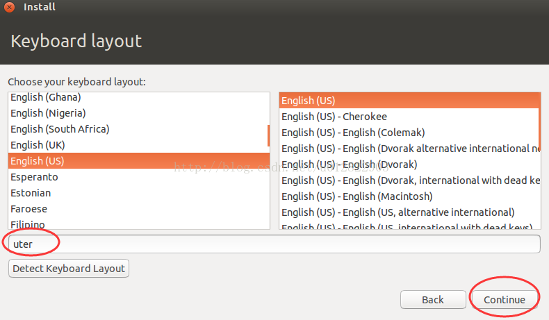 5.鍵盤(pán)布局,選用默認(rèn)的“US”,可以試試底下的隨便按幾個(gè)電腦鍵盤(pán)上的字母,看是否對(duì)應(yīng)不出差錯(cuò),選擇“繼續(xù)”。