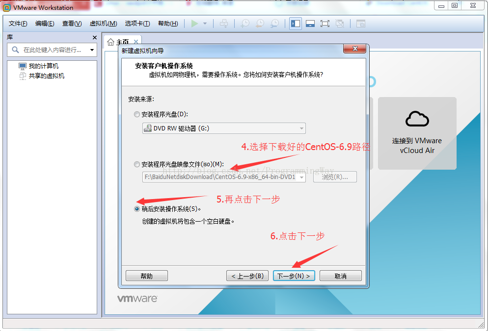 第三步:點(diǎn)擊安裝程序光盤(pán)映像文件-選擇下載好的CentOS的iso文件路徑,再點(diǎn)擊稍后安裝操作系統(tǒng),點(diǎn)擊下一步;