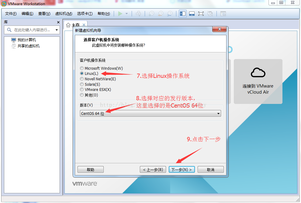 第四步:客戶(hù)操作系統(tǒng)選擇Linux,版本選擇對(duì)應(yīng)的版本,這里選擇的是CentOS 64位,點(diǎn)擊下一步;
