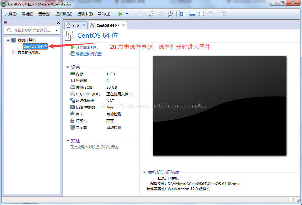 第九步:右擊虛擬機(jī)CentOS 64位,選擇電源——點(diǎn)擊打開(kāi)電源時(shí)進(jìn)入固件;