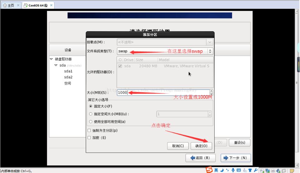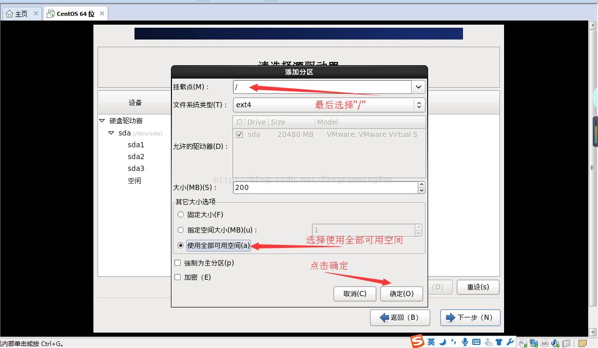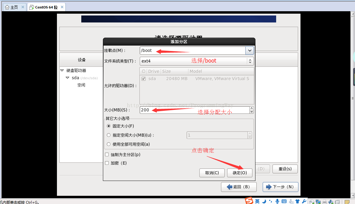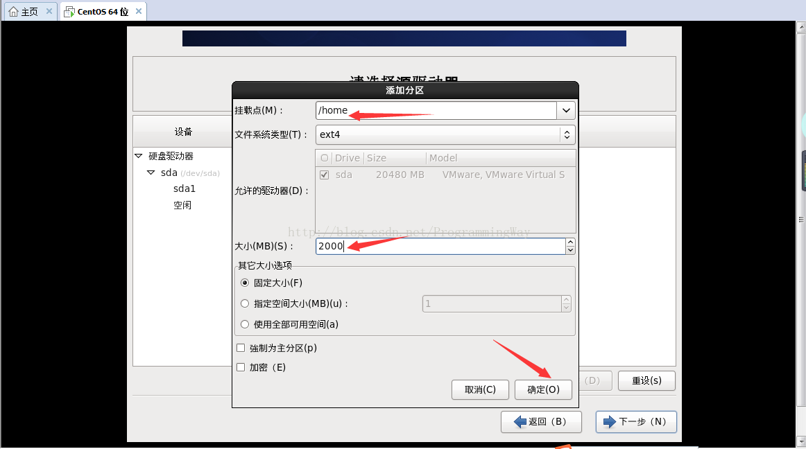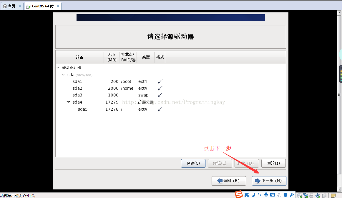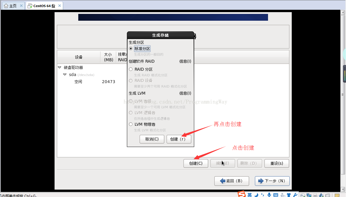 第二十三步:點(diǎn)擊創(chuàng)建,給系統(tǒng)分別分"/boot"、"/home"、"swap"、"/"分區(qū);