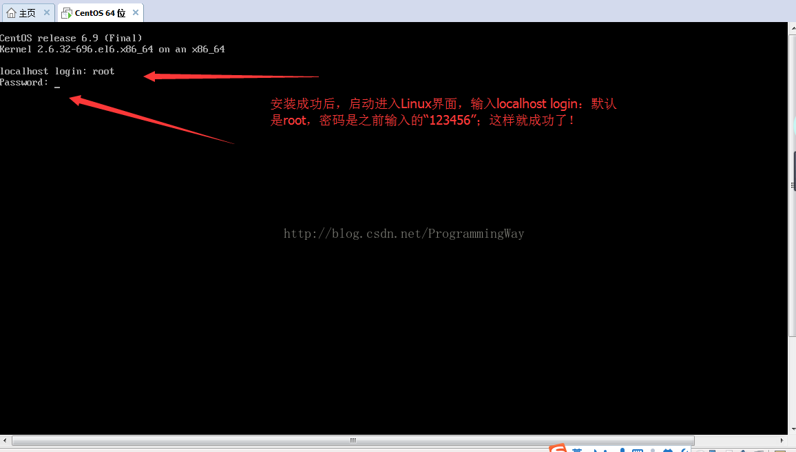 第二十八步:安裝成功,啟動(dòng)進(jìn)入下面的Linux開(kāi)機(jī)界面,輸入localhost login:root;密碼是之前設(shè)置的:123456;到此就完成了。