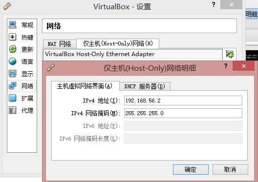 注:nat網絡用于“虛擬機”借用“宿主機”所在網絡訪問互聯(lián)網,但不能使宿主機和虛擬機互相ping通;所以需要在兩者之前拉一根“虛擬雙絞線”(即host-only模式)使兩機相互通信。另,這里的host-only ipv4地址是設置宿主機 在兩機之間搭建的局域網中的ip地址(一般設置192.168.56.XX)