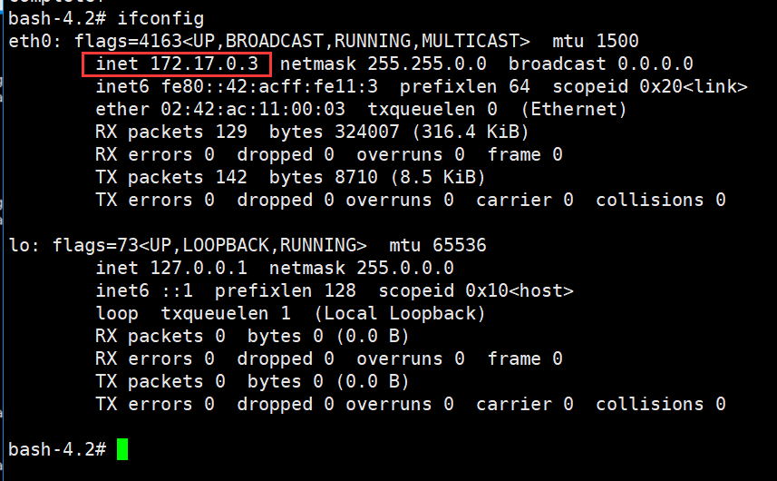 [root@docker web]# docker exec -it 76782ab /bin/bash bash-4.2# ifconfig