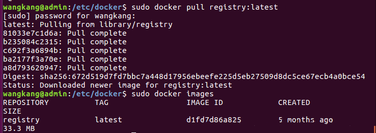 sudo service docker start //啟動(dòng)docker sudo docker pull registry //下載registry鏡像