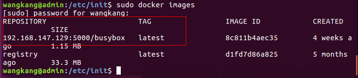 sudo docker pull 192.168.147.129:5000/busybox sudo docker images //查看192.168.147.129:5000/busybox鏡像的信息