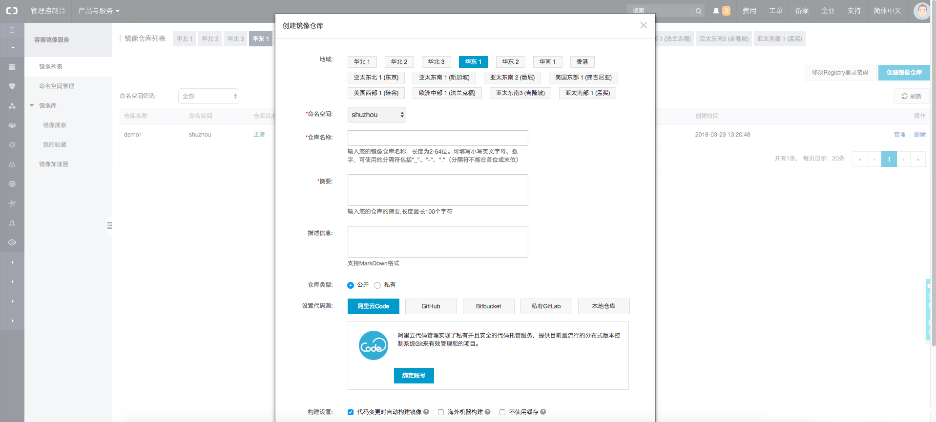 4.1、我使用的是阿里云的docker registry,感覺應(yīng)該會(huì)比較快。首先你要有一個(gè)阿里云的賬號(hào)。然后登陸進(jìn)去新建一個(gè)倉庫,設(shè)置命名空間等信息。
