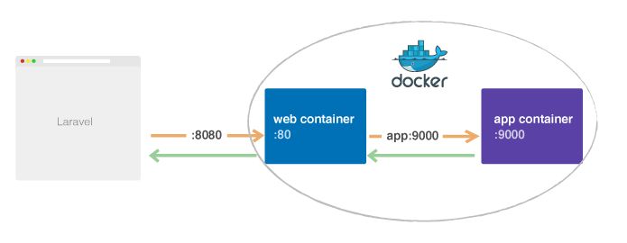 fastcgi_pass app:9000;nginx將對PHP的請求通過fastcgi傳遞給了app服務(wù)的9000端口,docker-compose會自動把services中定義的容器服務(wù)連接起來,各個服務(wù)相互之間使用服務(wù)名稱引用。