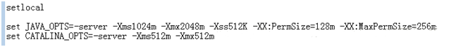 setJAVA_OPTS=-server -Xms1024m -Xmx2048m -Xss512K -XX:PermSize=128m-XX:MaxPermSize=256m setCATALINA_OPTS=-server -Xms512m -Xmx512m