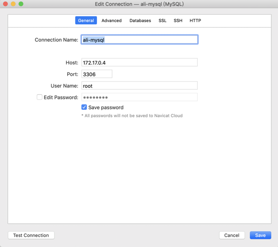 mysql的host 填寫docker內的IP,獲取方式為: