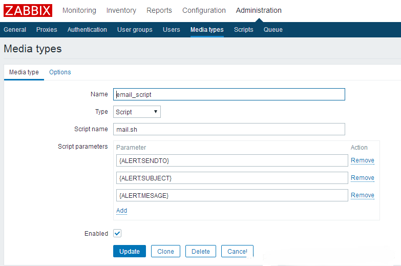 按照官網(wǎng)的介紹配置即可,這部分實在懶得寫了。唯一需要注意的是,media type需要添加3個參數(shù),分別是{ALERT.SENDTO},{ALERT.SUBJECT},{ALERT.MESAGE},分別對于mail.sh中的to、subject和body。