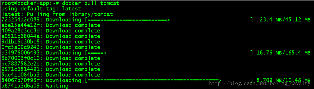 執(zhí)行命令docker pull tomcat,從hub.docker.com下載最新版本的tomcat鏡像,如下圖: