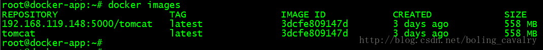 再執(zhí)行docker images查看鏡像的信息,如下圖,出現(xiàn)了一個新的鏡像,REPOSITORY是192.168.119.148:5000/tomcat: