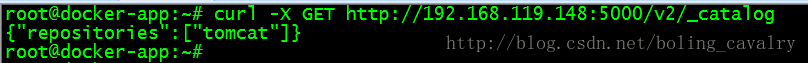 推送成功后,在docker-app和docker-registry上分別執(zhí)行curl -X GET http://192.168.119.148:5000/v2/_catalog,查看私有倉庫的鏡像信息,都能見到如下內(nèi)容: