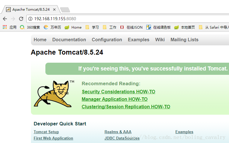 docker-app的IP是192.168.119.155,所以在當(dāng)前電腦上打開瀏覽器,輸入:192.168.119.155:8080,可以看到下圖熟悉的tomcat歡迎頁: