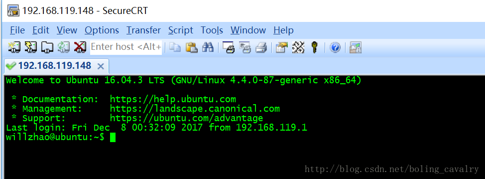 裝好系統(tǒng)后,用SecureCRT工具遠(yuǎn)程連接到虛擬機(jī)上,如下圖: