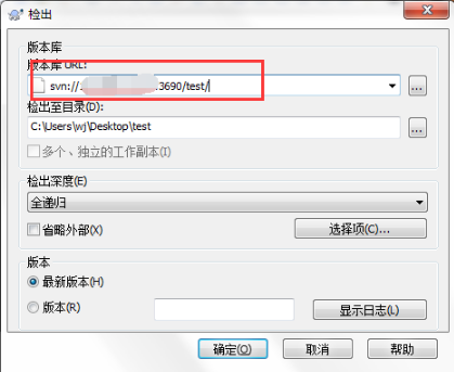 2:在版本庫上填寫linux的svn地址 svn://ip:3690/倉庫名 (這里的倉庫名不是/var/project/test而是/test)