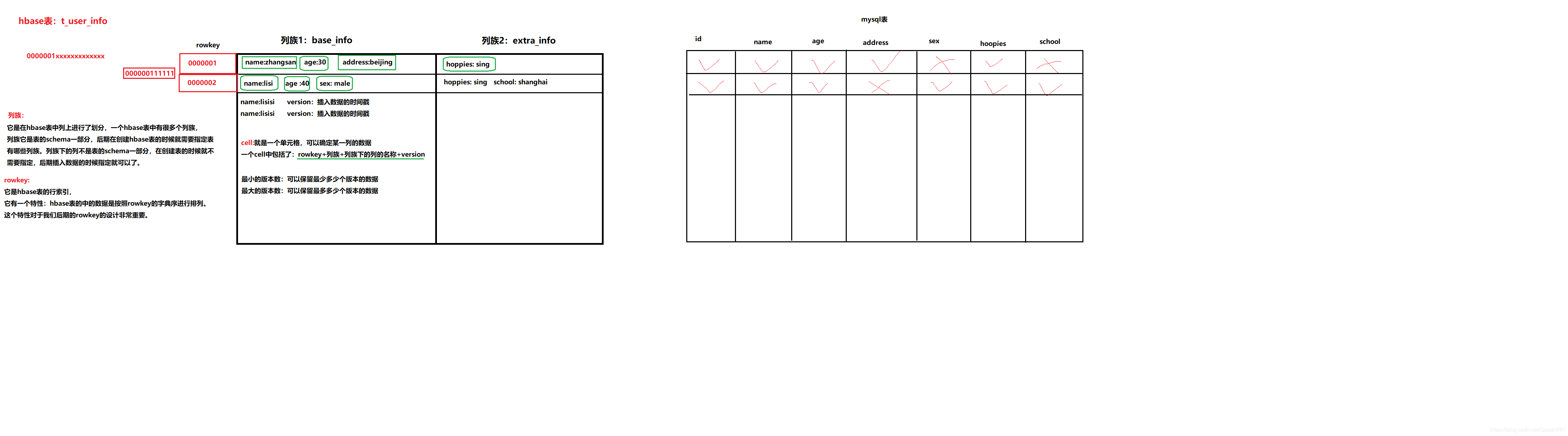 - mysql表中每一行列的字段是相同,而hbase表中每一行數(shù)據(jù)可以有截然不同的列。