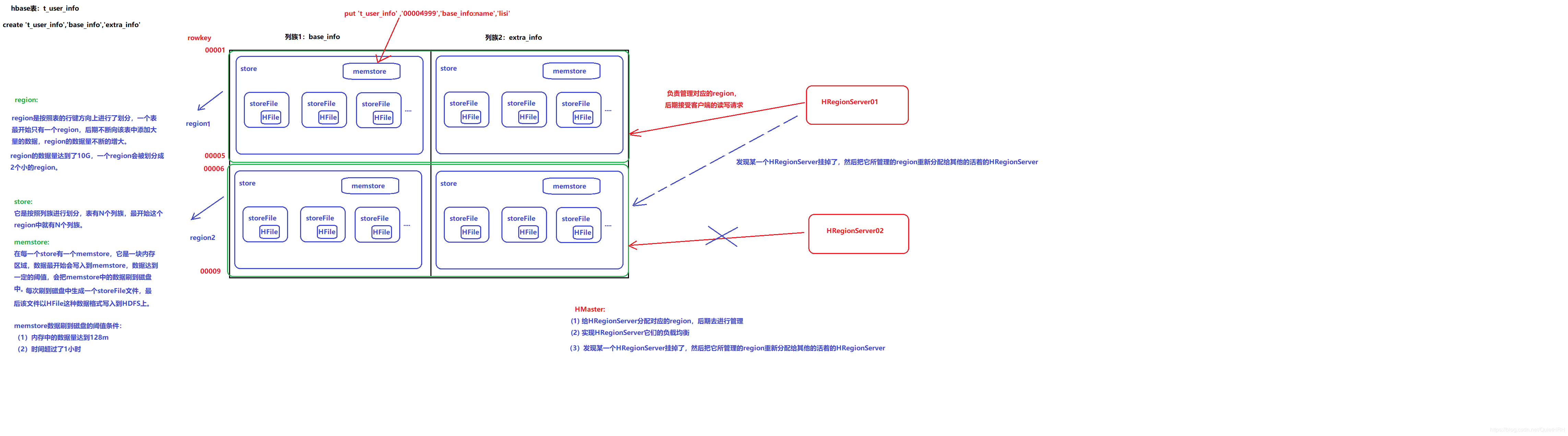 3、它會把掛掉的HRegionServer所管理的region重新分配給其他的活著的HRegionServer