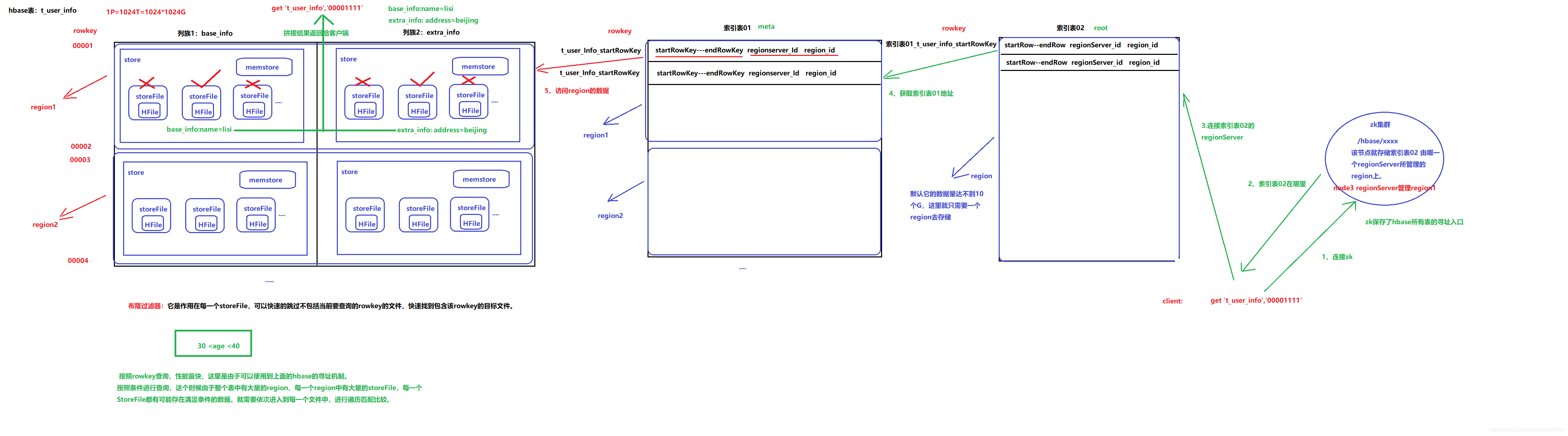 - ZooKeeper–> -ROOT-(單 Region)–> .META.–> 用戶表